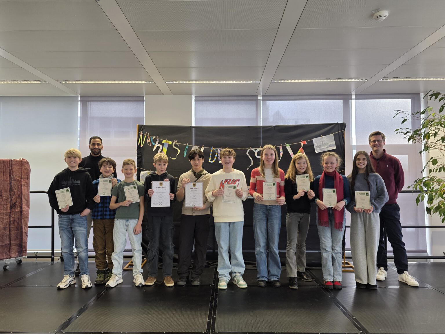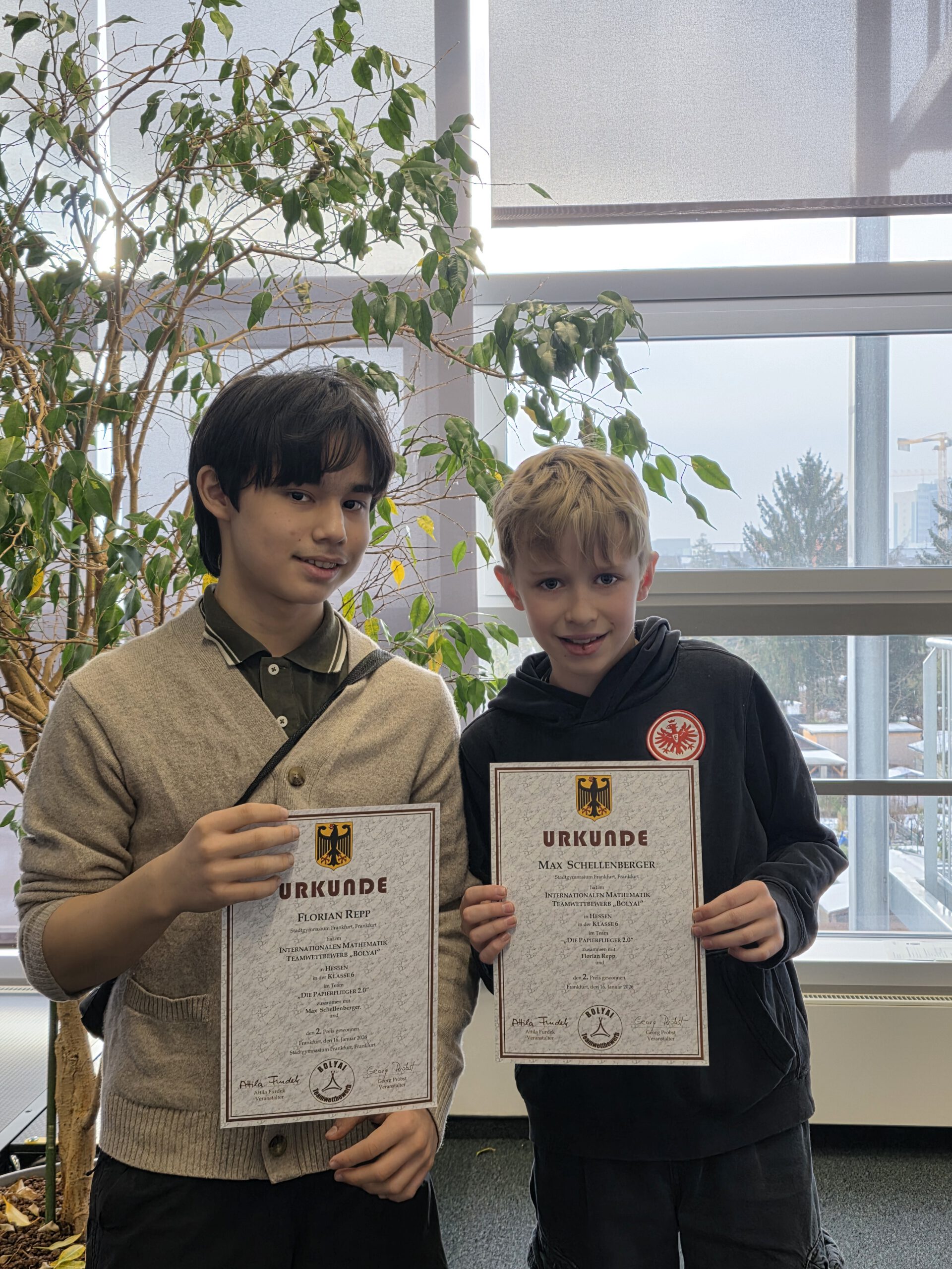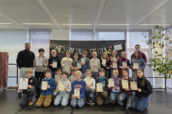 In Jahrgangsstufe 6 gab es 186 Gruppen. Die Schlausten von den Schlausten (Jara, Mina, Sarah) erreichten hier mit Rang 9 ein exzellentes Ergebnis. Den größten Erfolg schafften jedoch Max und Florian als Die Papierflieger 2.0. Für ihren herausragenden zweiten Platz wurden sie im Rahmen der Siegerehrung ausgezeichnet und durften sich über besondere Preise freuen. Die Fachschaft Mathematik gratuliert allen Teilnehmer:innen herzlich zu ihren großartigen Leistungen!