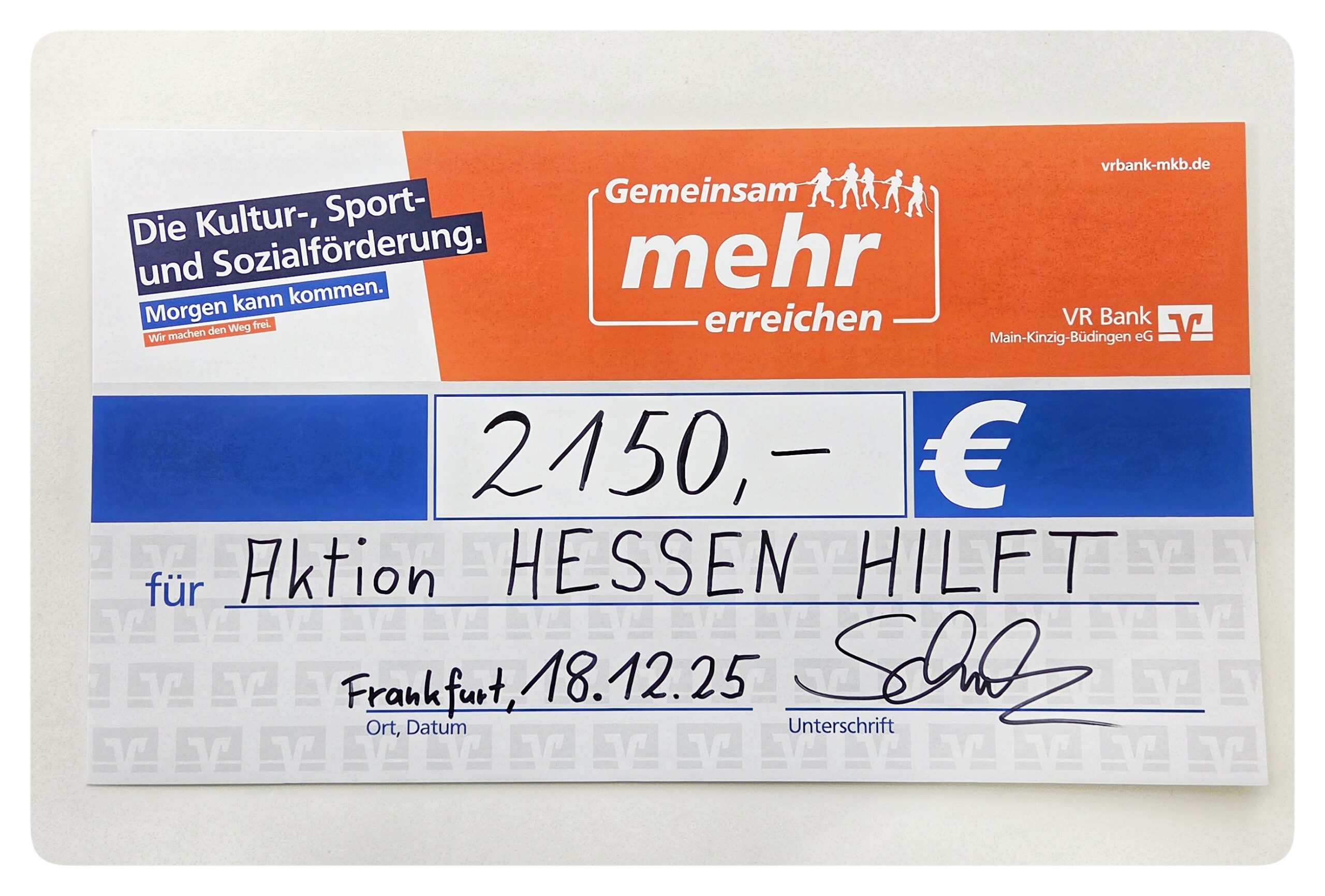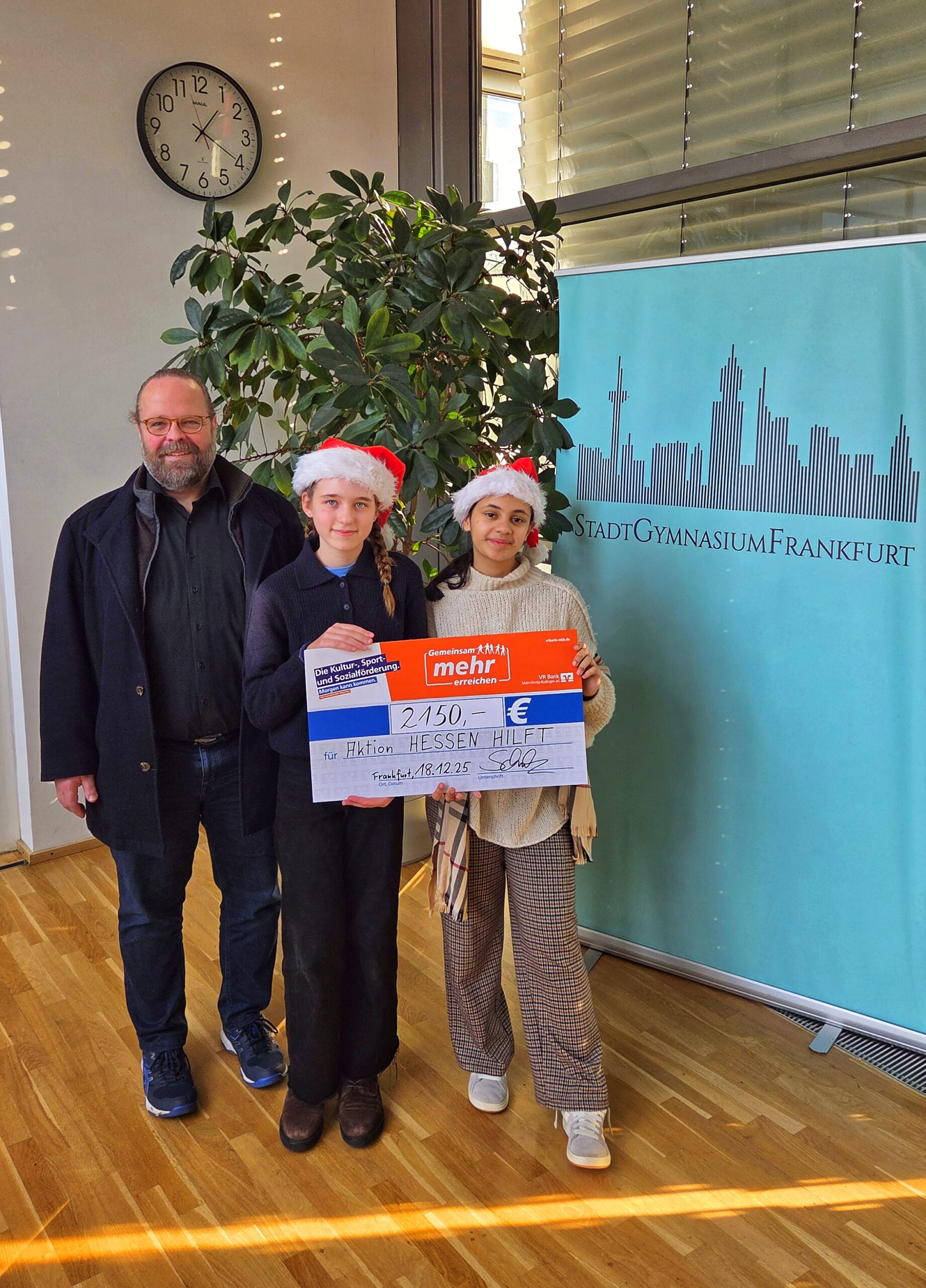 Die Spendenbereitschaft in dieser kurzen Zeit war enorm. Es kam ein Betrag von EUR 2.150,- zusammen. Wow! Das ist wirklich überragend. Die Spendengelder wurden am 18. Dezember an Herrn Greilich von der „Aktion Hessen hilft!“ überreicht. Im Gegenzug werden wir von der Organisation zum wiederholten Male mit der Plakette als „Engagierte Schule 2025“ ausgezeichnet.