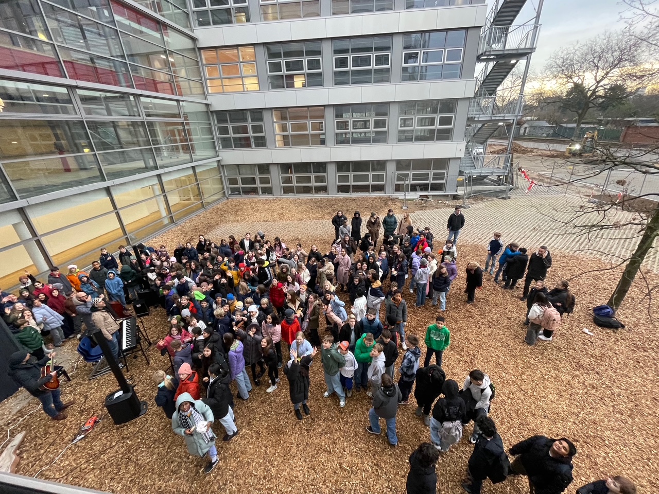 In fast schon traditioneller Art und Weise hat sich am letzten Schultag vor den Weihnachtsferien die gesamte Schüler- und Lehrerschaft auf dem Schulhof versammelt und ist mit dem gemeinsamen Singen von drei Weihnachtsliedern in die Ferien gestartet. Gelebte Verbindung!